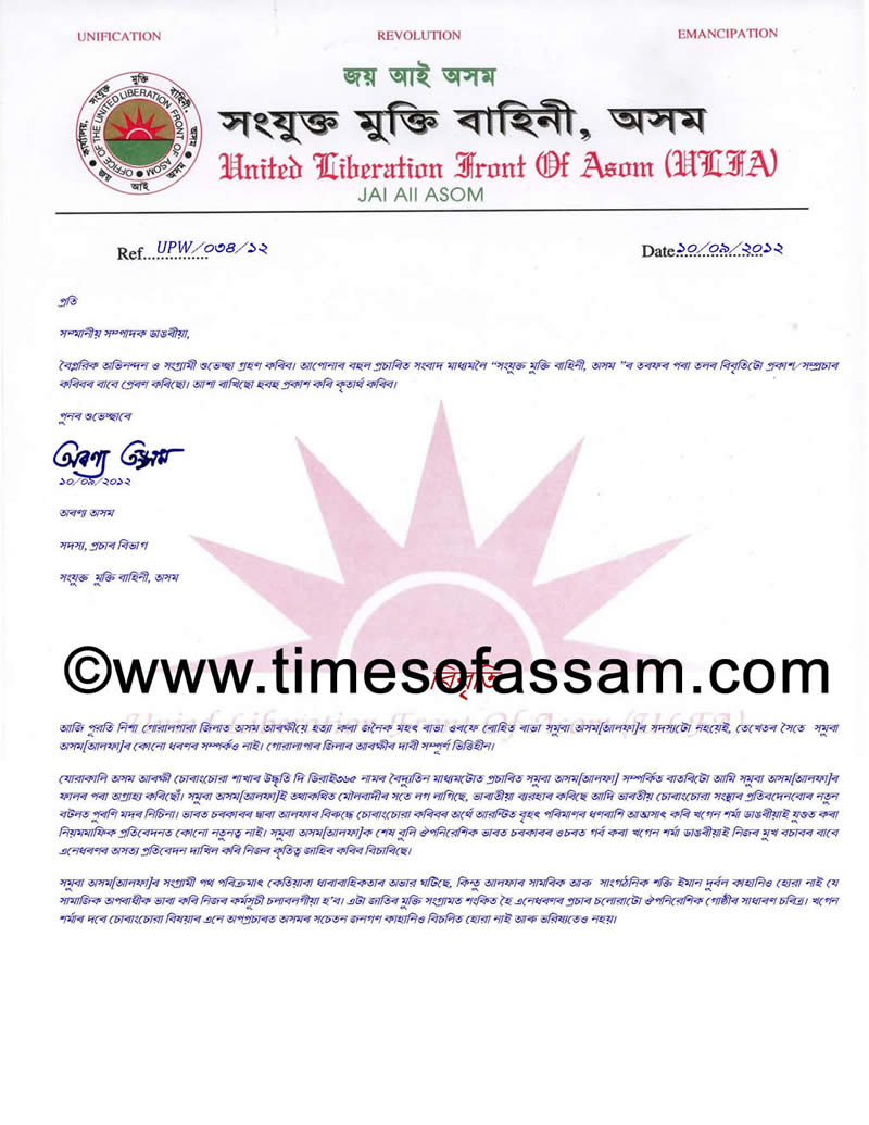 Signed by the member of Central Publicity Wing of ULFA, Aranya Asom, the outfit said, “It is nothing new when Khagen Sharma claims that ULFA has merged with so-called religious extremists. Khagen Sharma is passing such remarks to continue his loot on the huge funds provided by Government of India for counter insurgency operations. Such remarks by Mr. Sharma is a regular practice with the lie to regulate his position before colonial Government of India”.