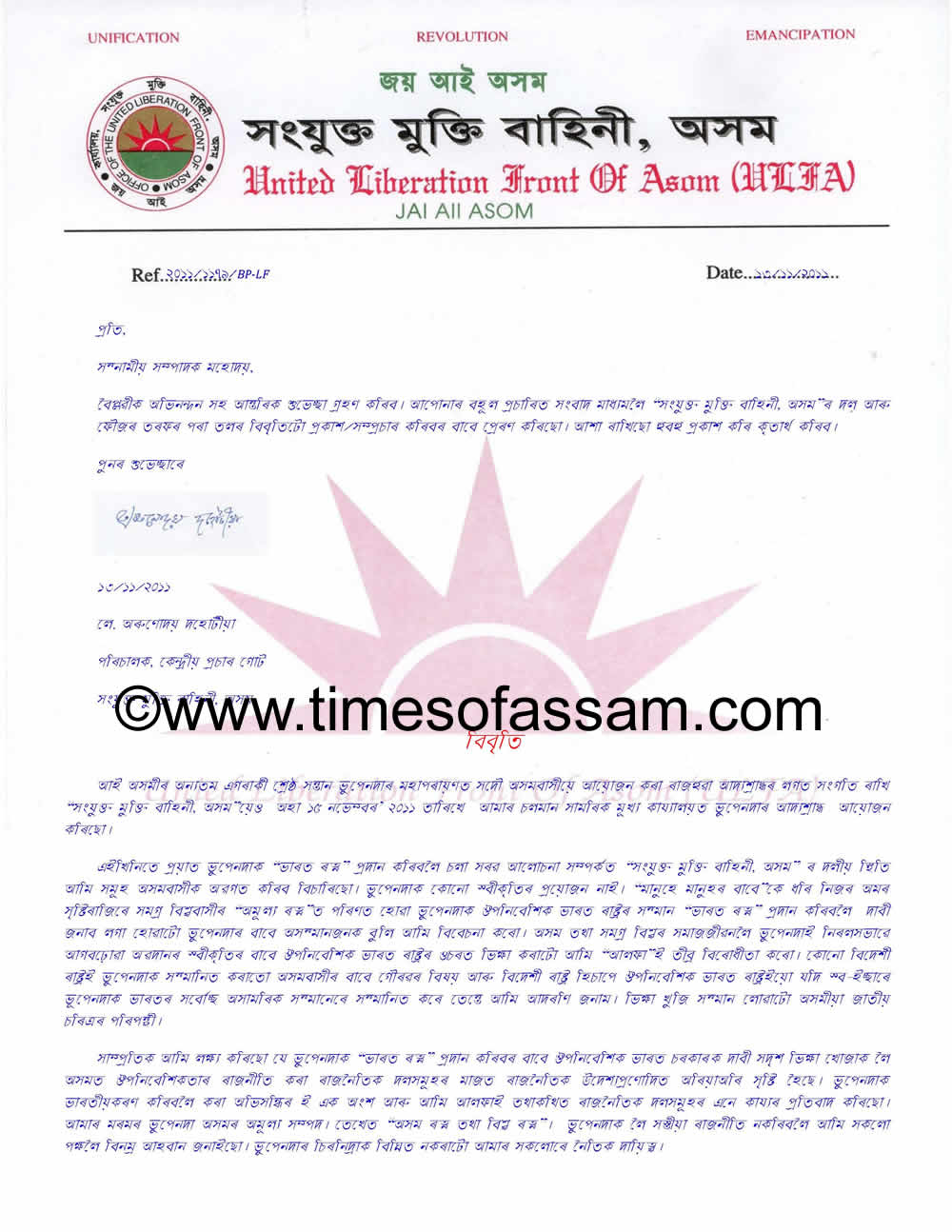 ‘We, ULFA, oppose the begging to Colonial Indian State for any reorganizations to Bhupen Hazarika. It would be a matter of proud if any country honors Bhupenda, so as a foreign country if Colonial Indian State too honors Bhupenda with their highest Civil Honor, then we will welcome it. Even so, getting honor by begging is against the character of Assamese Nation. .’- the outfit also added in the press release.